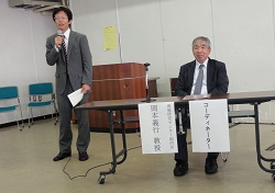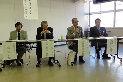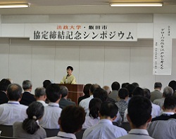 また、その後、会場を移して、14時15分から「協定締結記念シンポジウム」が始まり、まず田中総長による「グローバル化を江戸から考える」をテーマとした記念講演が開催されました。その後、「飯田の未来と法政大学との連携」をテーマとしたパネルディスカッションが岡本副所長、石神教授、小門教授、高柳教授、牧野市長の参加で行われ、飯田市に関係のある各教員から様々なコメントをいただきました。
