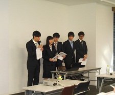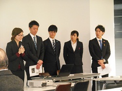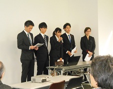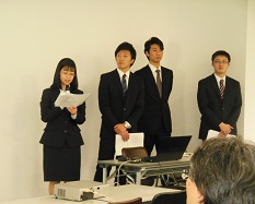 最終成果報告会はその一年の活動の集大成として、個々のクライアントに対して事業の企画や仕事の改善に向けた具体的な提案を公表するものです。学年も学部も違う23人の学生が4チームに分かれ、それぞれ工夫を凝らしたプレゼンテーションを行いました。