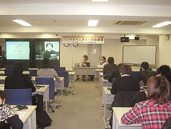 引き続き、行われたパネルディスカッションでは、田路則子経営学部准教授、阿部博美氏(米国在住コンサルタント)の両者をコーディネーターにKeyvan、二村、梶の3氏を交えて、参加学生から盛んな質問が飛び交いました。中には将来は海外でベンチャービジネスを志す者もいて、太平洋を越えた意見交換は予定時間を過ぎ盛会のうちに終了しました。